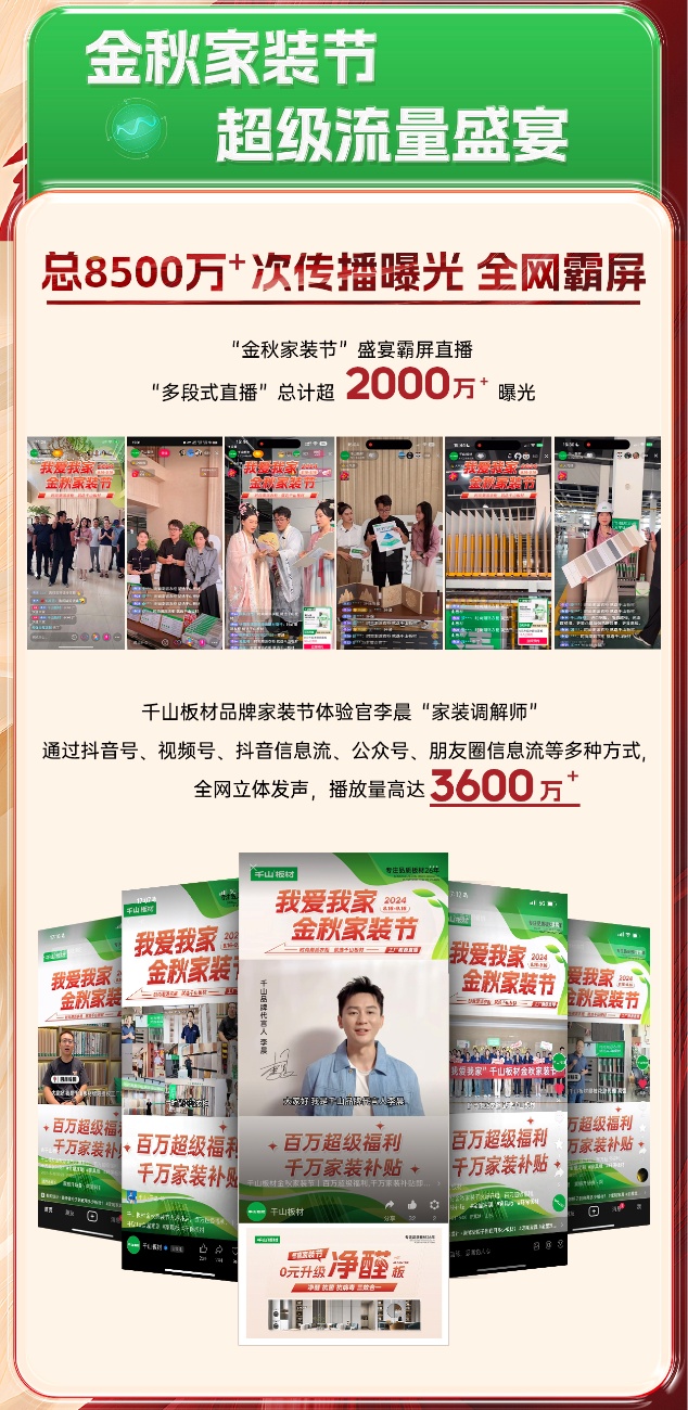 8月16日,千山金秋家装节火爆上线,截至9月16日,为期30天的家装节活动日前正式落下帷幕。活动期间,千山板材全国1500 门店联动,全网曝光量超8500万、线上直播观看量超2000万、签约数量达3500 ,实现了品牌声量和销售业绩的双丰收!